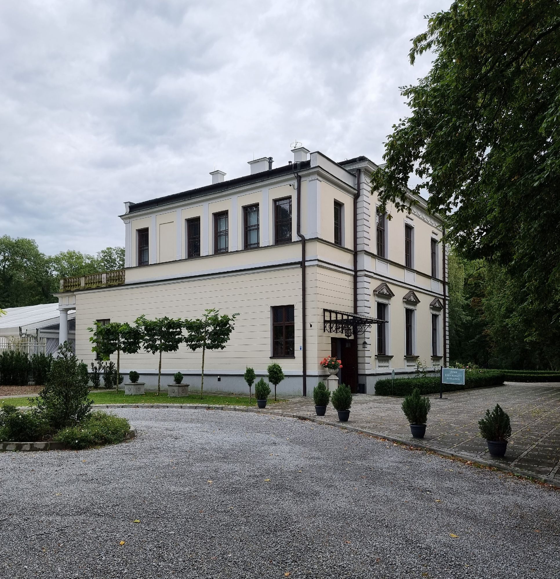 Na całość zespołu pałacowego nie składa się jedynie główny budynek – ważną rolę odgrywa również oficyna, w której mieści się restauracja „Oficyna” oraz Garden Cafe, pełniące funkcję kulinarnego zaplecza całej rezydencji. Nowe obiekty, takie jak Szopa Antonówka czy oranżeria, zostały wkomponowane w istniejący układ w sposób wyraźnie podporządkowany historycznej osi widokowej i zieleni, dzięki czemu nie dominują nad pałacem, lecz naturalnie się z nim uzupełniają. Spacerując po terenie widać, że główne budynki mieszkalne, zaplecze kuchenne i eventowe są rozłożone tak, aby ruch gości rozchodził się po różnych częściach ogrodu, nie zakłócając spokojniejszej części parku i strefy przy stawach.